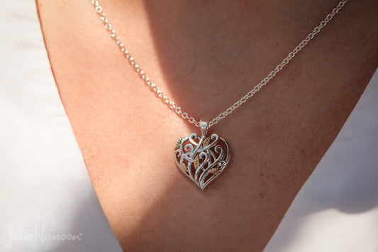 Elvish Heart Pendant, Sterling Silver with Yellow Gold Leaves