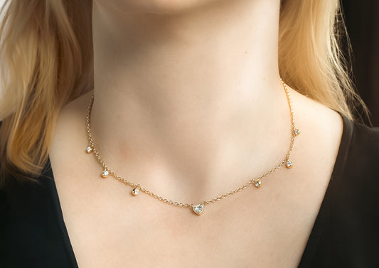 Station Necklace with Heart and Round Diamonds, 18ct Yellow Gold, J3070