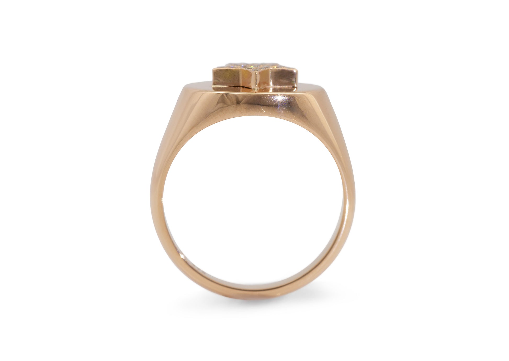 This refined round red gold Signet Ring features a 9.7mm star atop, elegantly adorned with 25 pavé-set, 1mm round faceted diamonds for a striking finish.