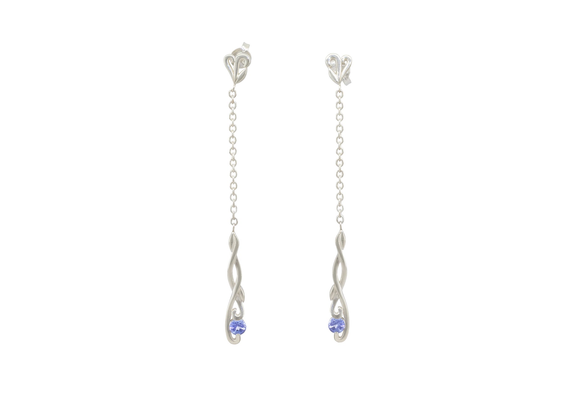 This pair of earrings features a custom CAD-designed Elvish motif crafted from sterling silver wire approximately 1mm thick and measuring around 63mm in length. The design includes a delicate vine stud adorned with a single 3.5mm round faceted AA Tanzanite, complemented by elegant plain leaves. The design incorporates a fine chain, enhancing the intricate vine style.