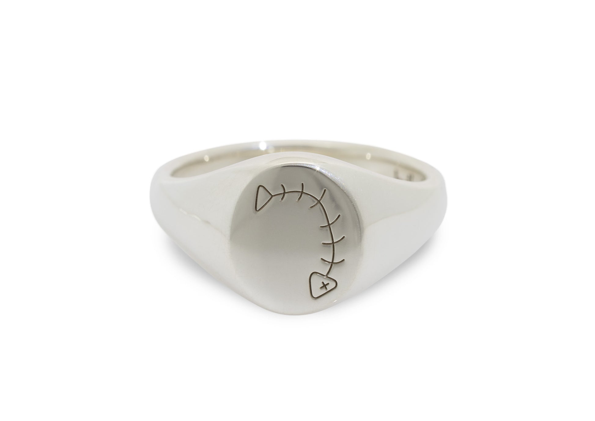 Unique and fun, this small oval signet is customised for the client with a hand drawn fish skeleton, engraved to fit the curve of the signet's surface. Crafted in Sterling Silver, this ring is a perfect, eye catching piece for easy everyday wear.