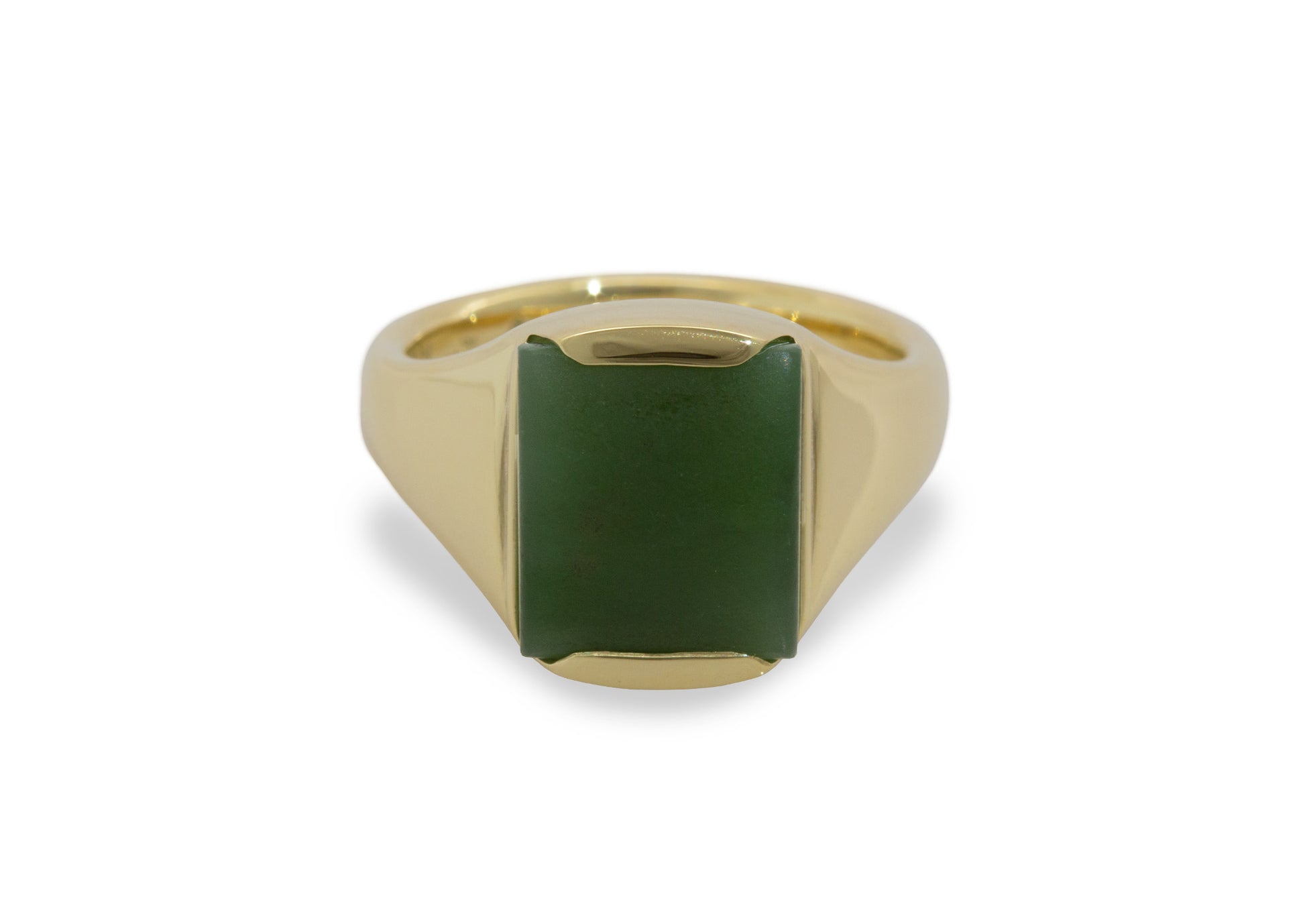 This 14ct Yellow Gold quadrant signet ring features a semi bar setting showcasing the client's own rectangular greenstone. Distinctive and refined, it is personalised through the gemstone rather than traditional engraving.