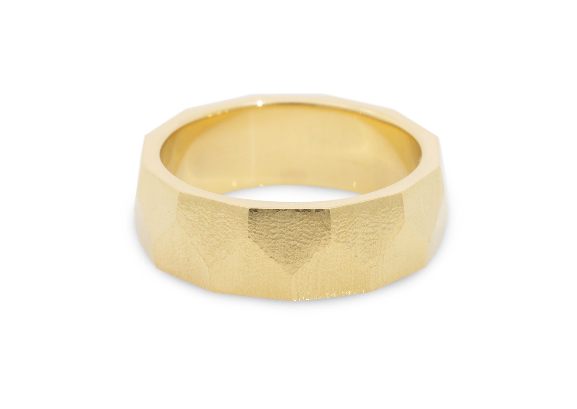 Strong, modern and vibrant, this ring is perfect for any occasion. This Yellow Gold Architecturally inspired 7.5mm wide Wedding Band with faceted detailing and textured finish.