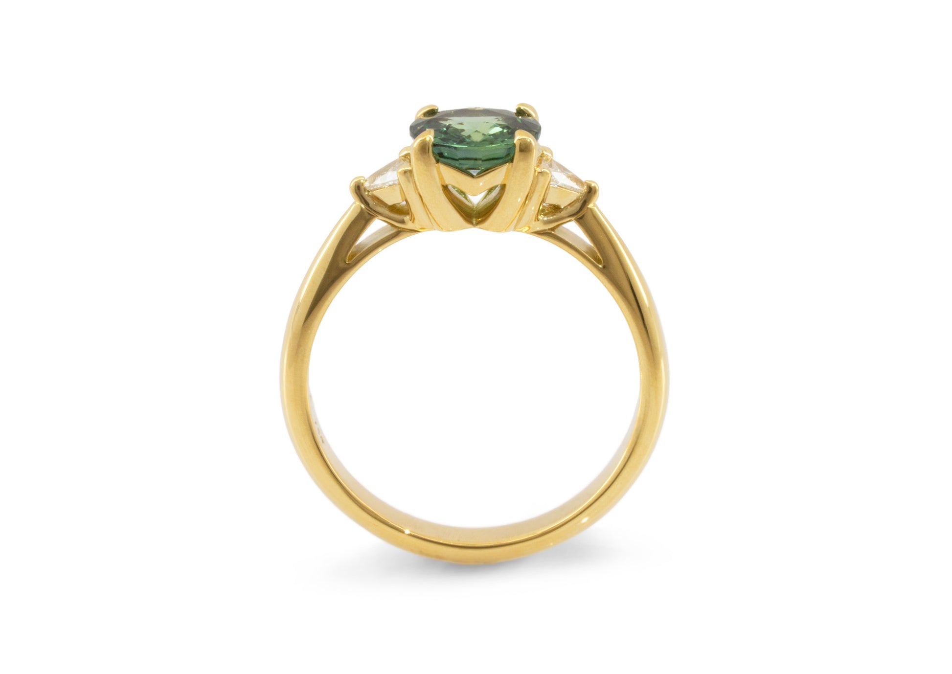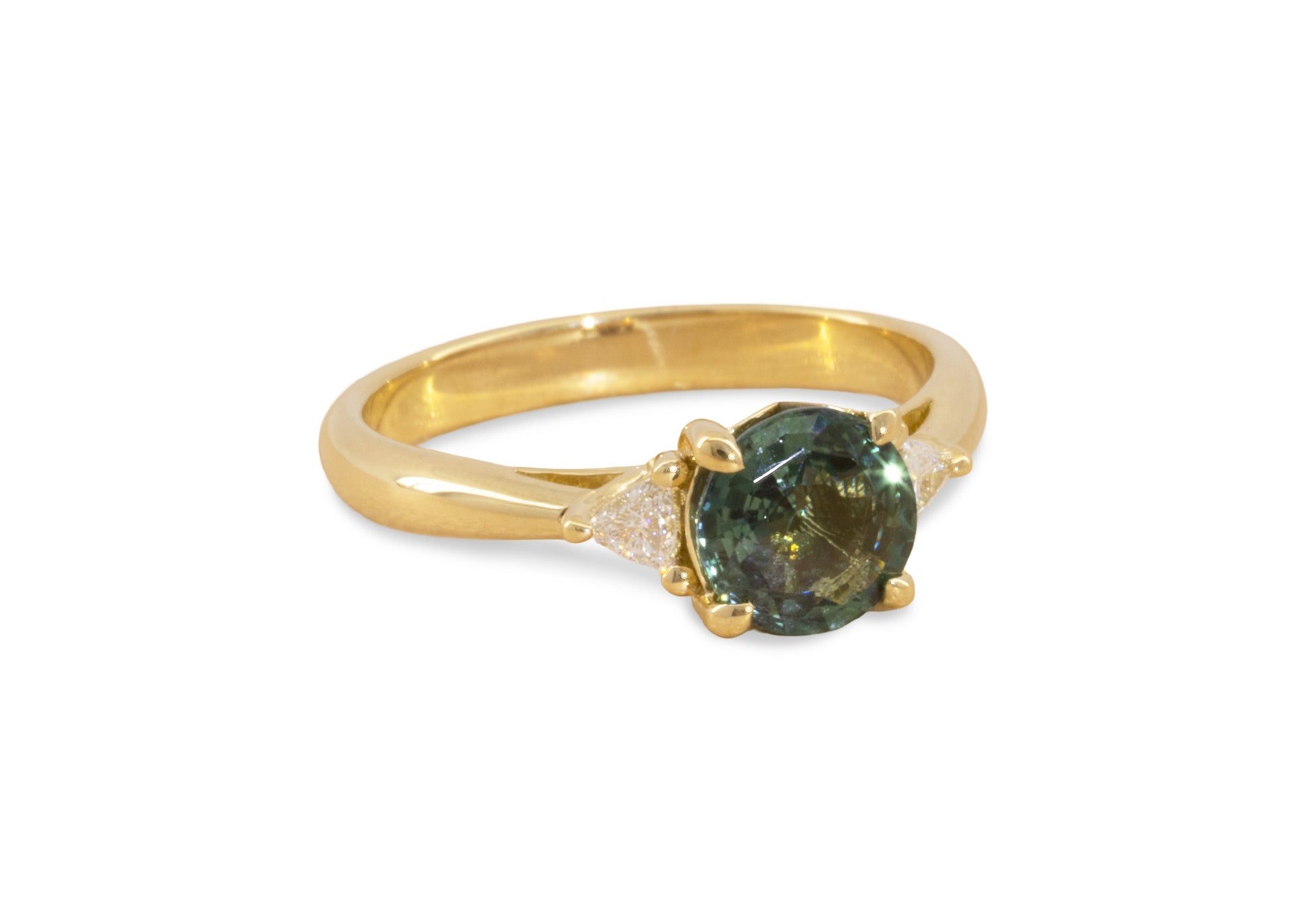 The stunning centrepiece features a magnificent 1.87ct teal green sapphire, cut into a brilliant 7mm round facet that captures light with captivating depth and colour. Flanked by two earth-mined natural diamonds—each a sparkling 3mm trillion cut stone graded GHI SI1—this ring achieves a perfect balance of sophistication and radiance.