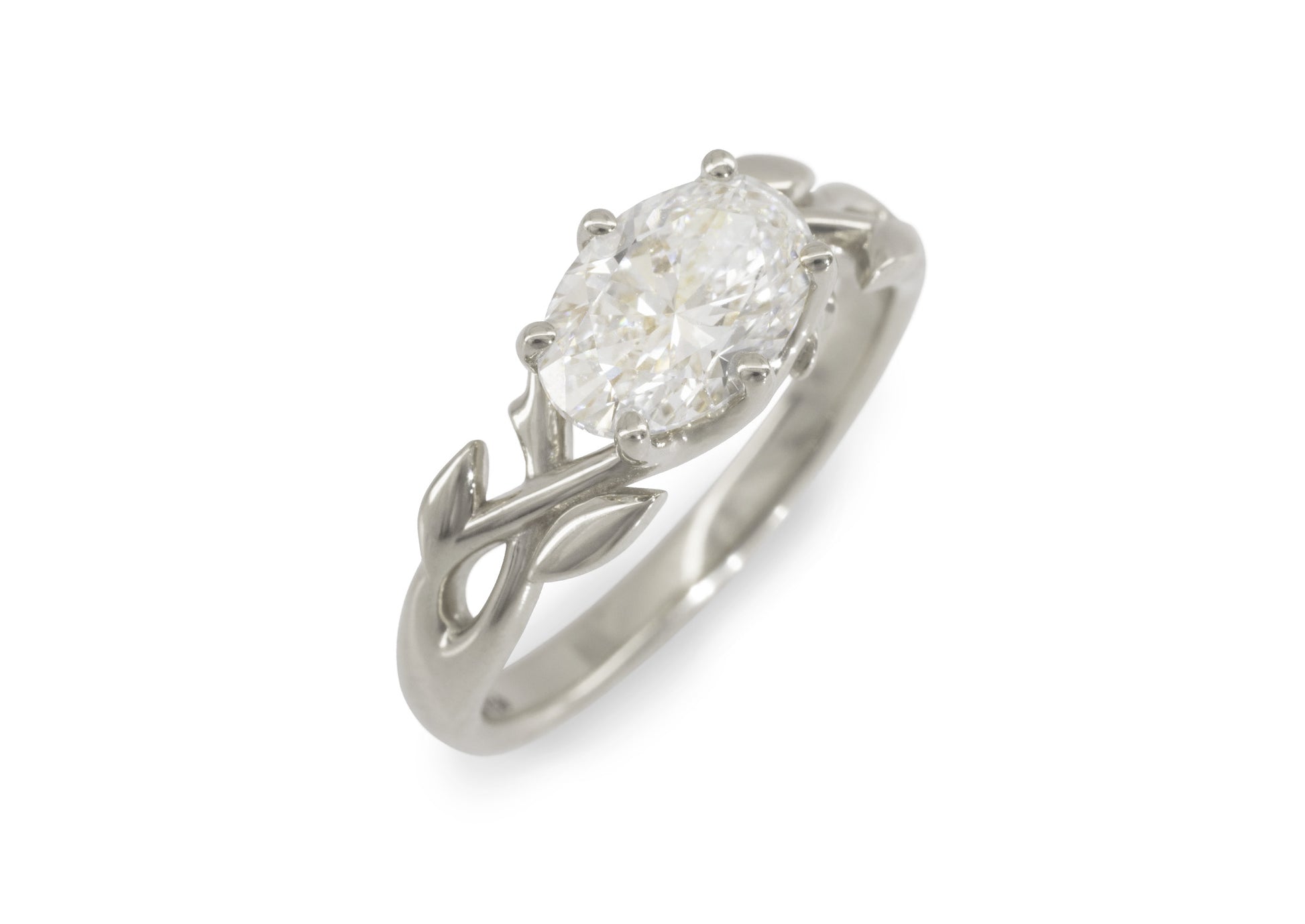 A white gold or platinum engagement ring featuring a 2-carat oval faceted lab-grown diamond set in an east–west orientation. Leaf and vine details complete the design, which pairs with the matching J3339 Vine Wedding Band.