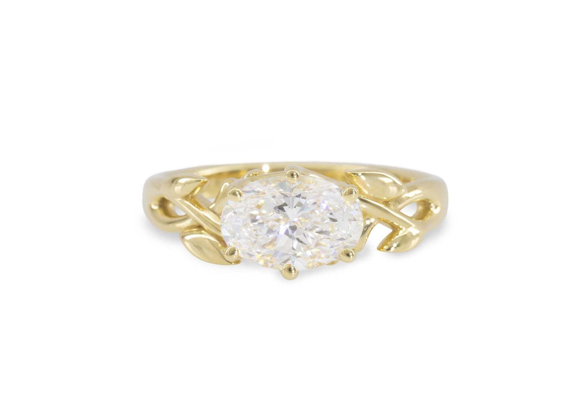 A yellow gold engagement ring featuring a 2-carat oval faceted lab-grown diamond set in an east–west orientation. Leaf and vine details complete the design, which pairs with the matching J3339 Vine Wedding Band.