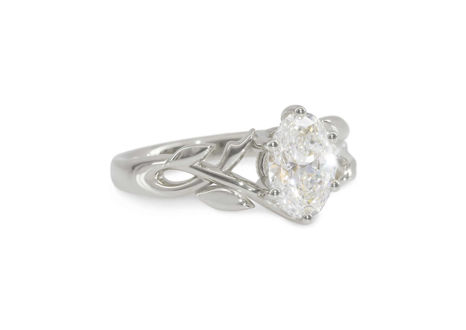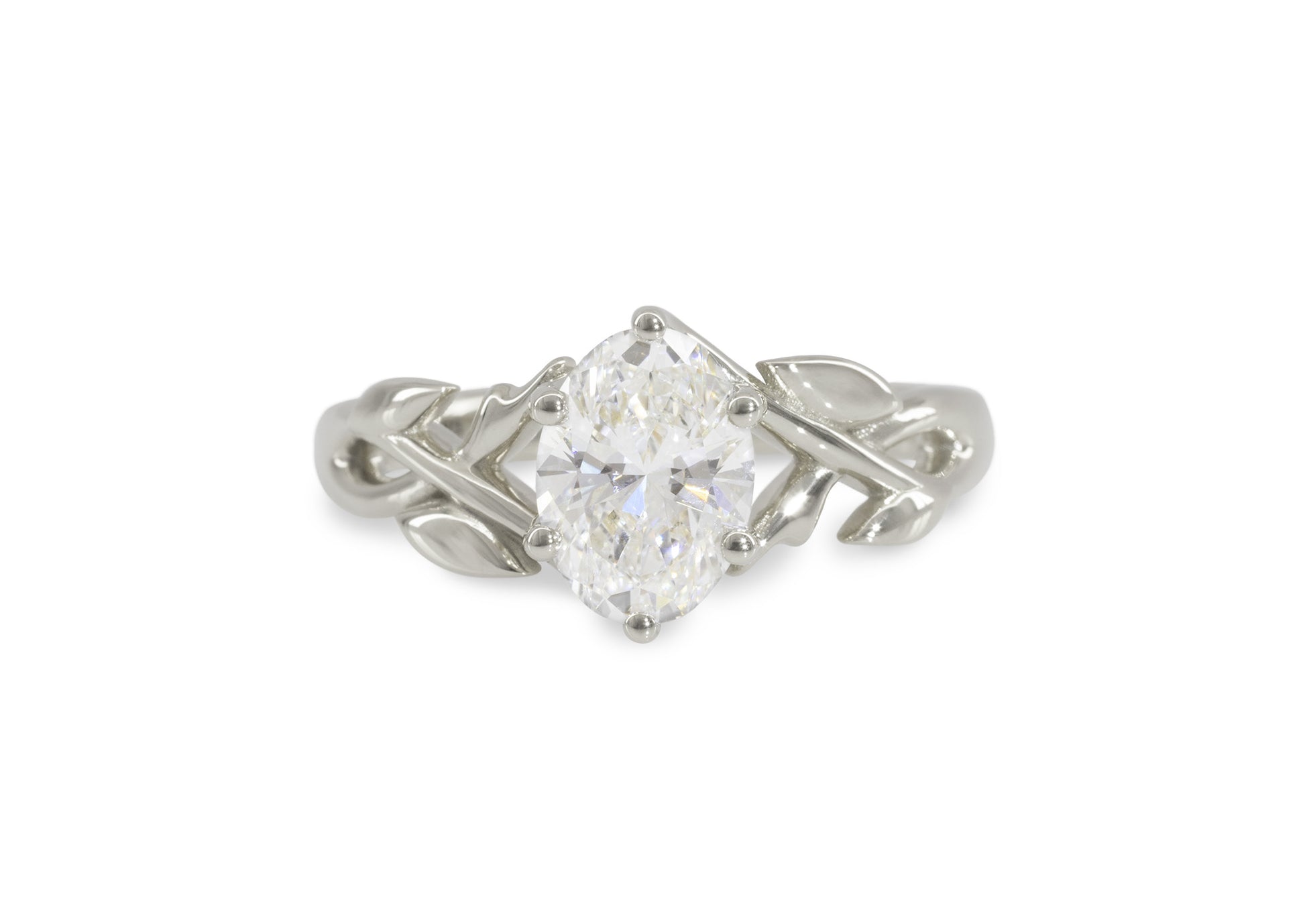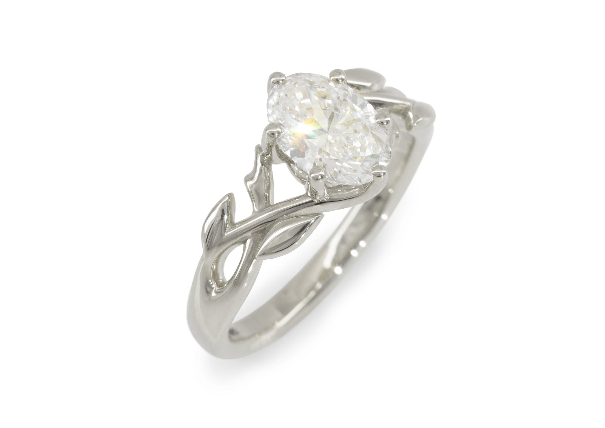 A white gold & platinum engagement ring featuring a 1.5-carat oval faceted lab-grown diamond set in a north–south orientation. Leaf and vine details complete the design, which pairs with the matching J3341 Vine Wedding Band.