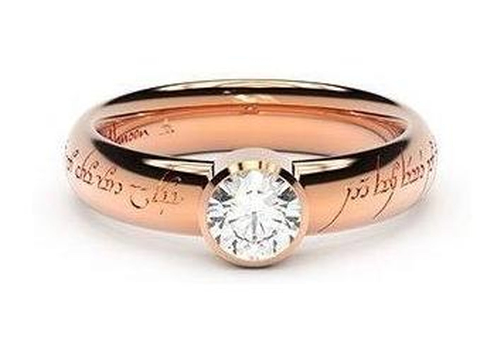 Elegant moden styling, fashioned in 9ct Yellow Gold, this ring features a straight bezel setting that showcases the brilliance of the diamond. The band has the same unique shape as our famous Ring and is Engraved with our Elvish Love Poem putting this design a step above the ordinary.