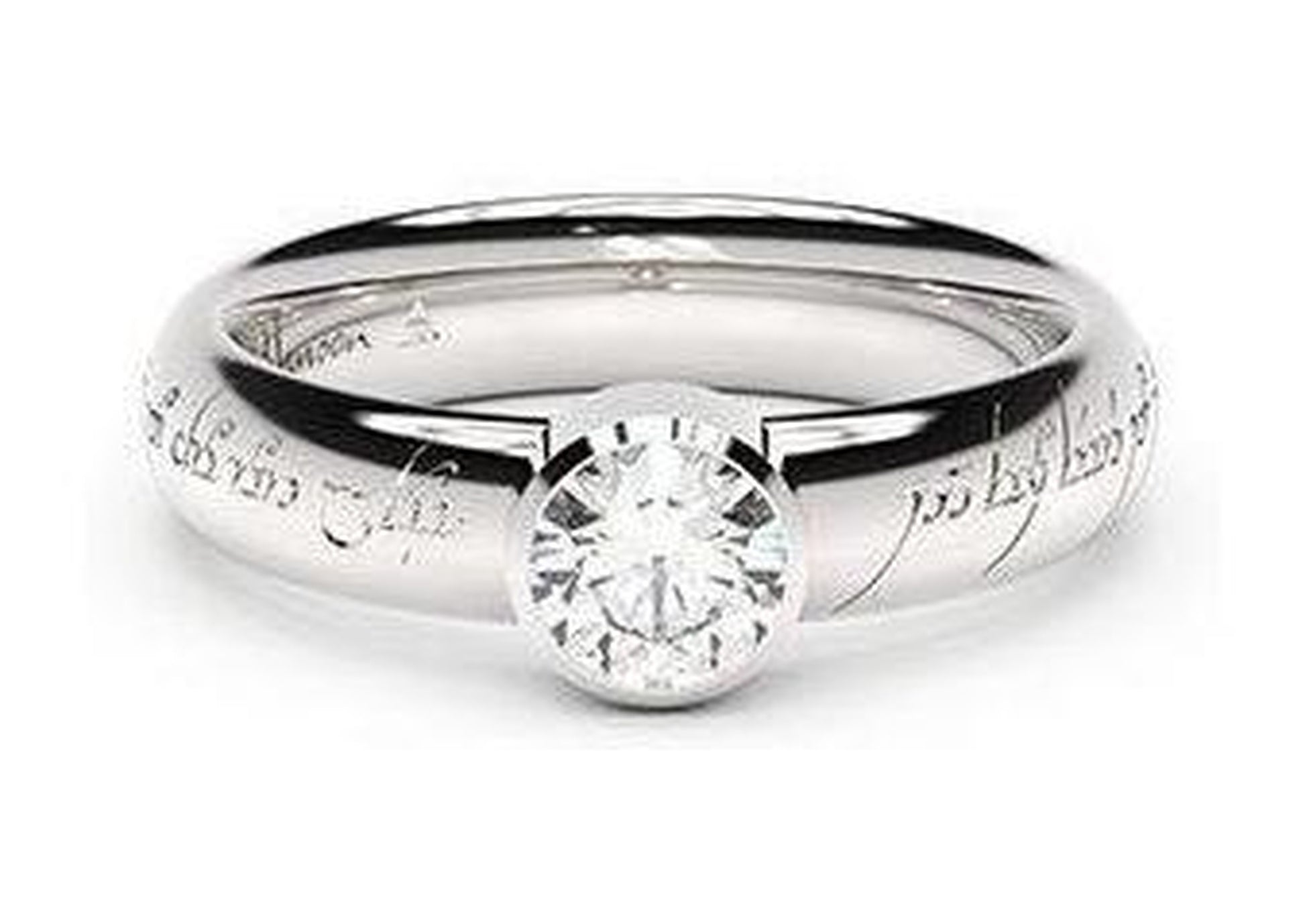Elegant moden styling, fashioned in 9ct Yellow Gold, this ring features a straight bezel setting that showcases the brilliance of the diamond. The band has the same unique shape as our famous Ring and is Engraved with our Elvish Love Poem putting this design a step above the ordinary.