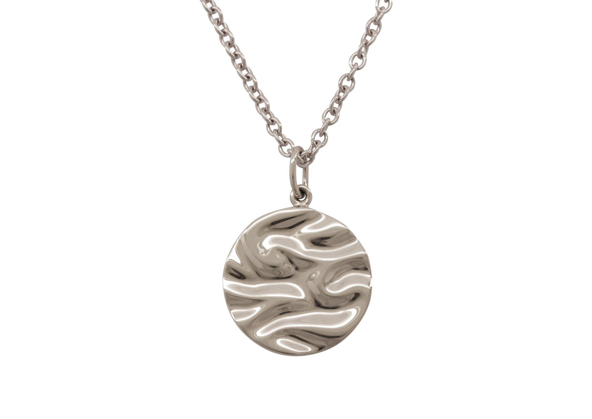 A striking White Gold or Platinum round pendant, featuring a polished finish and flowing silk-inspired wave design.